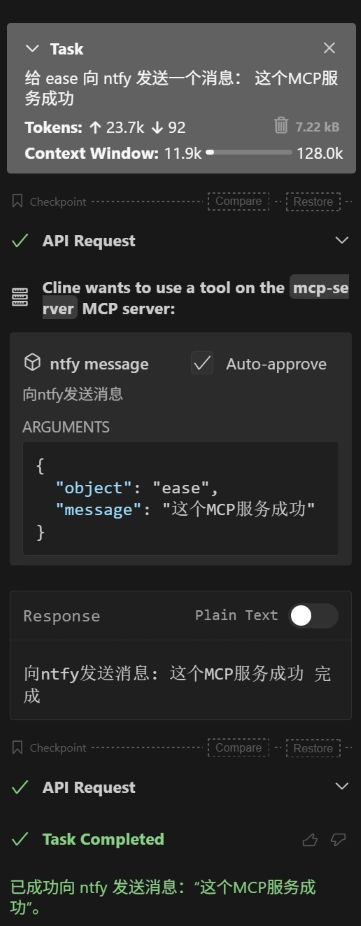 至于动态发现,现在还没看到。我所理解的动态发现是指(例如本地Stdio),无需指定而能够自动找到服务工具。测试了VSCode中的Cline,还是需要指定MCP服务的。