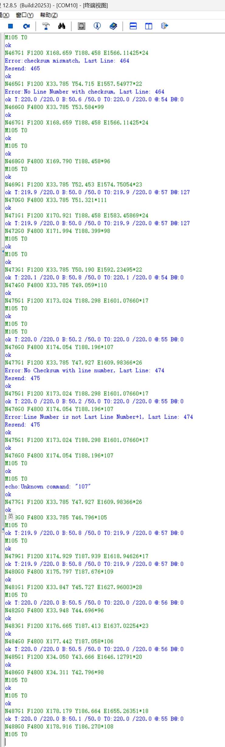 M105 获取挤出机温度 T:25.6 /0.0 B:26.8 /0.0 T0:25.6 /0.0 @:0 B@:0 (挤出头温度25.6 热床25.6)